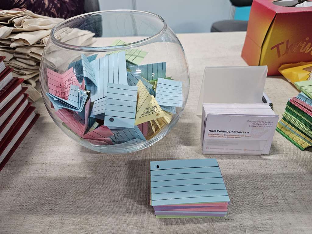 This year, Ravi was guided to introduce a prayer bowl at the stand, a special place where visitors could write down their prayers, hopes and things they wished to release. Many were deeply moved by this simple yet powerful ritual, stopping by the stand to take a moment of pause in the exhibition’s vibrant energy. Visitors shared that after placing their prayers in the bowl, they felt a sense of relief and lightness, as if a weight had been lifted. The prayer bowl became a place for reflection, offering calm in the heart of the bustling event.