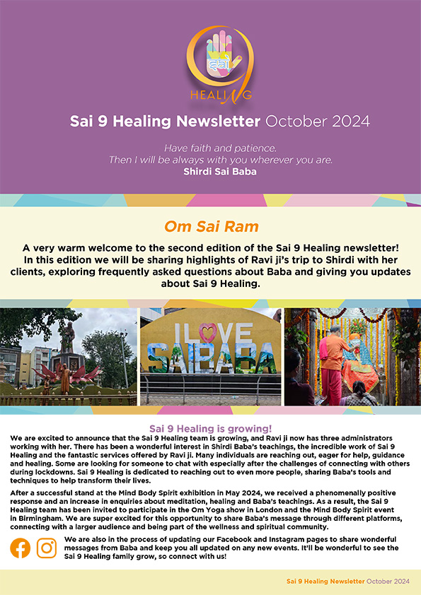 A very warm welcome to the second edition of the Sai 9 Healing newsletter! In this edition we will be sharing highlights of Ravi ji’s trip to Shirdi with her clients, exploring frequently asked questions about Baba and giving you updates about Sai 9 Healing.