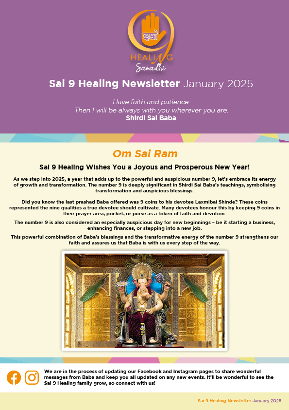 Sai 9 Healing Wishes You a Joyous and Prosperous New Year! As we step into 2025, a year that adds up to the powerful and auspicious number 9, let’s embrace its energy of growth and transformation. The number 9 is deeply significant in Shirdi Sai Baba's teachings, symbolising transformation and auspicious blessings.